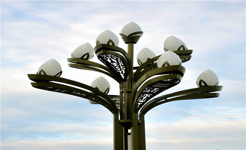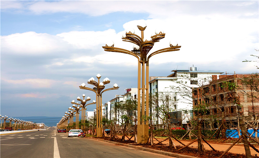 八叉九火玉蘭燈,燈高16米,燈桿呈古銅色,外觀造型大氣而有質(zhì)感,桿體內(nèi)側(cè)安裝LED節(jié)日氛圍燈條;光源采用全LED光源,替代傳統(tǒng)鈉和節(jié)能燈光源,道路照度均勻度和環(huán)境進一步提升。