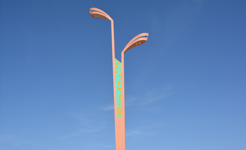 夜幕降臨,魔方燈陣通過(guò)預(yù)設(shè)的光效變換模式,開(kāi)始了絢麗的表演秀,時(shí)而忽快,時(shí)而忽慢;時(shí)而交相輝映,時(shí)而如夢(mèng)如幻,為哈密的夜空增添絢麗的色彩,為當(dāng)?shù)厥忻癯尸F(xiàn)一場(chǎng)燈光的視覺(jué)盛宴。梧桐絮語(yǔ),燈高10m,運(yùn)用玉蘭燈頭,輔之以鏤空的梧桐剪影,流暢的線條,V型的桿體,帶來(lái)強(qiáng)烈的視覺(jué)沖擊。該燈主照明光源采用LED,裝飾光源位于梧桐剪影的下方,每當(dāng)夜幕降臨燈光開(kāi)啟,婆娑的梧桐樹(shù)影便活潑生動(dòng)的展示出來(lái)。