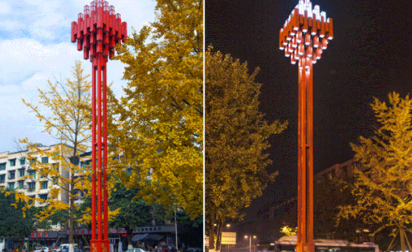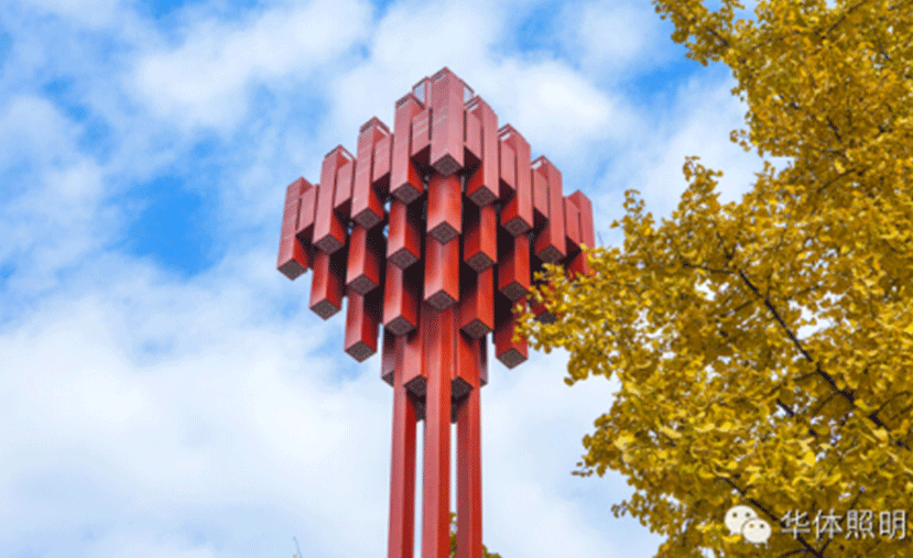 吉祥結(jié),佛教八寶之一,聳立在佛光廣場噴水池的兩側(cè),以挺拔的姿態(tài)守衛(wèi)著市民的安寧。這款燈具以吉祥結(jié)造型,同時,立體幾何堆疊的形式又使得峨眉群山的巍峨得以體現(xiàn),在色彩上,選取具有中國特色的紅色,吉慶而祥和,表達(dá)對旅博會舉行圓滿的美好祝愿,展示著峨眉這座城市特有的文化魅力。