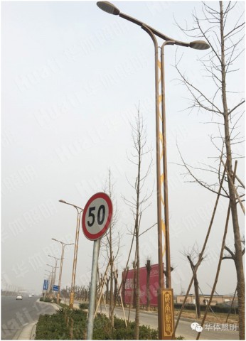 新區(qū)內(nèi)工業(yè)大道及幸福大道運(yùn)用的景觀路燈,曲線簡(jiǎn)潔大方。燈頭采用華體專(zhuān)利“和諧”,工業(yè)感強(qiáng),棕色桿體內(nèi)鏤空的金黃色紋理活潑生動(dòng),底座加載文化元素—漢儀篆書(shū)繁體“渭南新區(qū)美麗經(jīng)開(kāi)”與“魅力新城 田園都市”字體垂直均勻分布于燈桿底座上。
