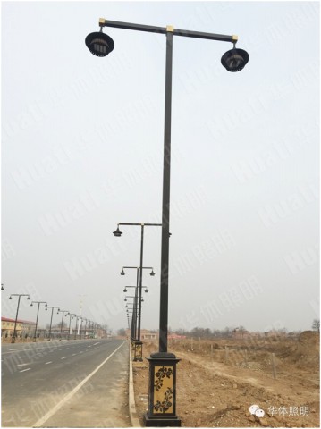 建設(shè)路,黑色桿體的景觀燈宏偉整齊的屹立在車(chē)道兩旁,矗立延伸,華麗而莊重。采用特殊工藝的自制燈頭,垂直于燈臂兩側(cè),立體感強(qiáng)。單桿連接的底座,黑色金屬板鏤空雕花,代表渭南市花月季栩栩如生,傳遞地域文化。