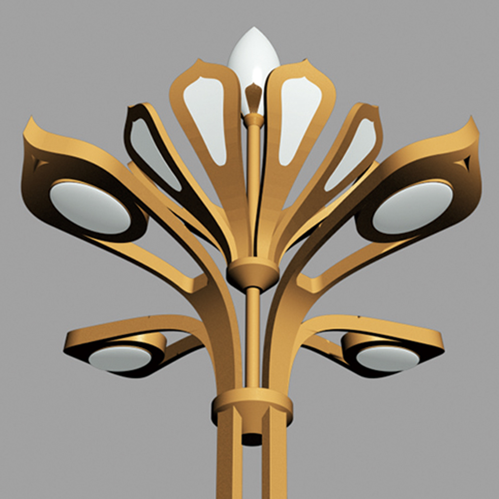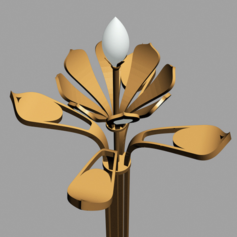 燈型整體造型以蓮花含苞待放的外形為設(shè)計(jì)元素,結(jié)合華燈造型特征,達(dá)到功能與景觀照明為一體的戶外燈具;