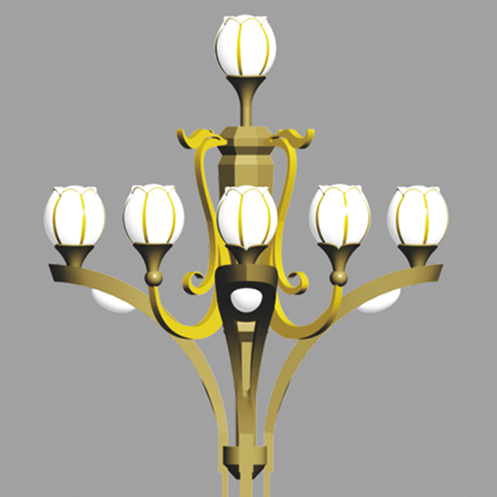 燈型主體、桿體、底座材質(zhì)為金屬鋼件表面熱鍍噴塑,燈罩采用花形玻璃罩,燈具為鋁件,可配光源LED/鈉燈。