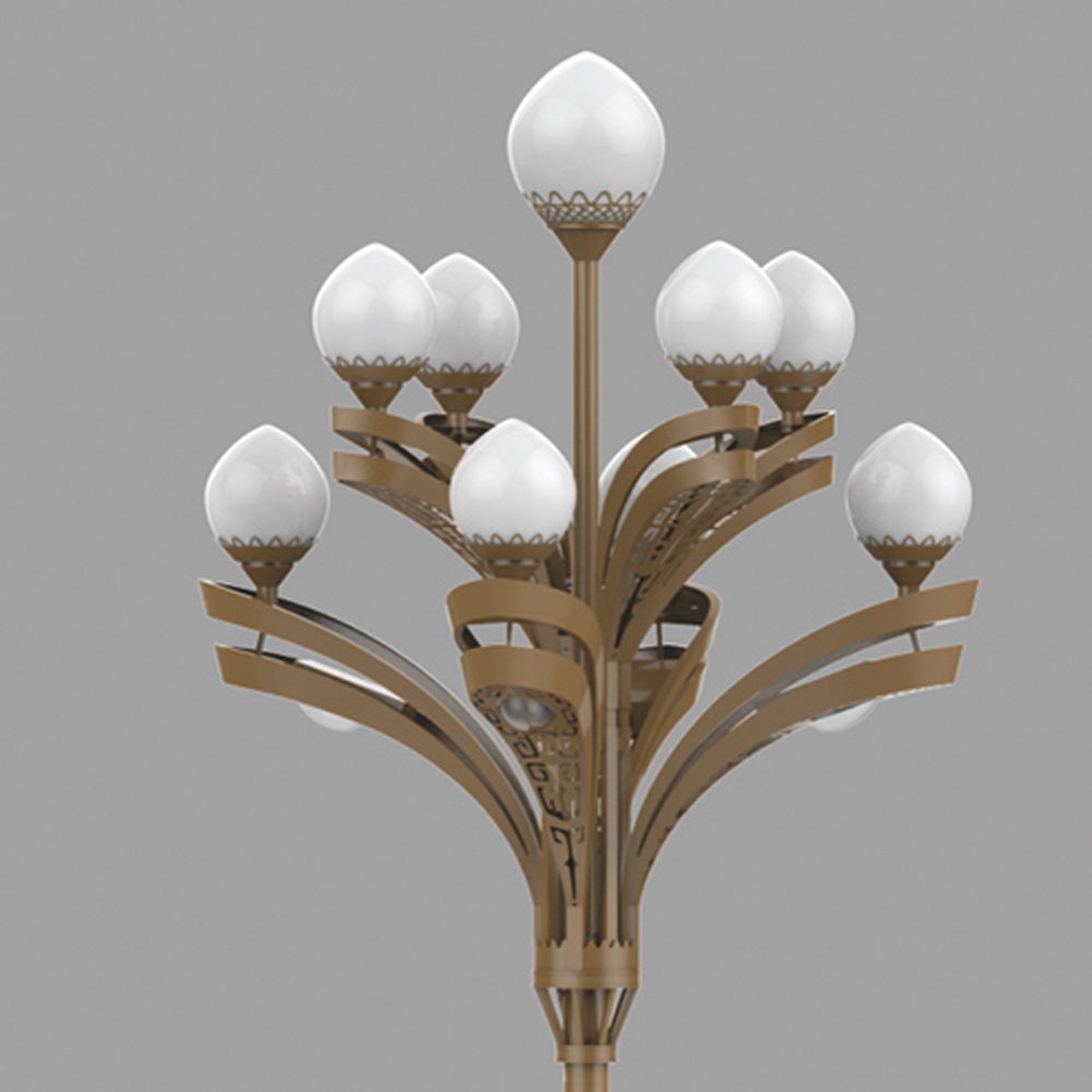荔枝中華燈的設(shè)計(jì)是在玉蘭燈設(shè)計(jì)的基礎(chǔ)上運(yùn)用創(chuàng)新思維,將荔枝的形態(tài)作為元素,突破傳統(tǒng)觀念進(jìn)行設(shè)計(jì)與開發(fā)的一款新型多頭道路燈,在外觀上實(shí)現(xiàn)了厚重與輕秀、傳統(tǒng)與現(xiàn)代的完美結(jié)合,給人以華麗高貴之感;