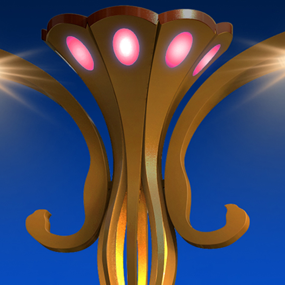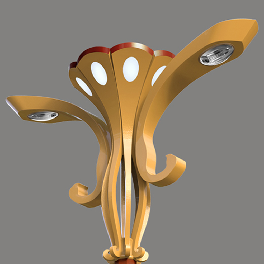 燈臂的設(shè)計(jì)以飛翔的鳳凰姿態(tài)為元素,將鳳凰的尾部特征高度提煉作為燈具的主體造型。