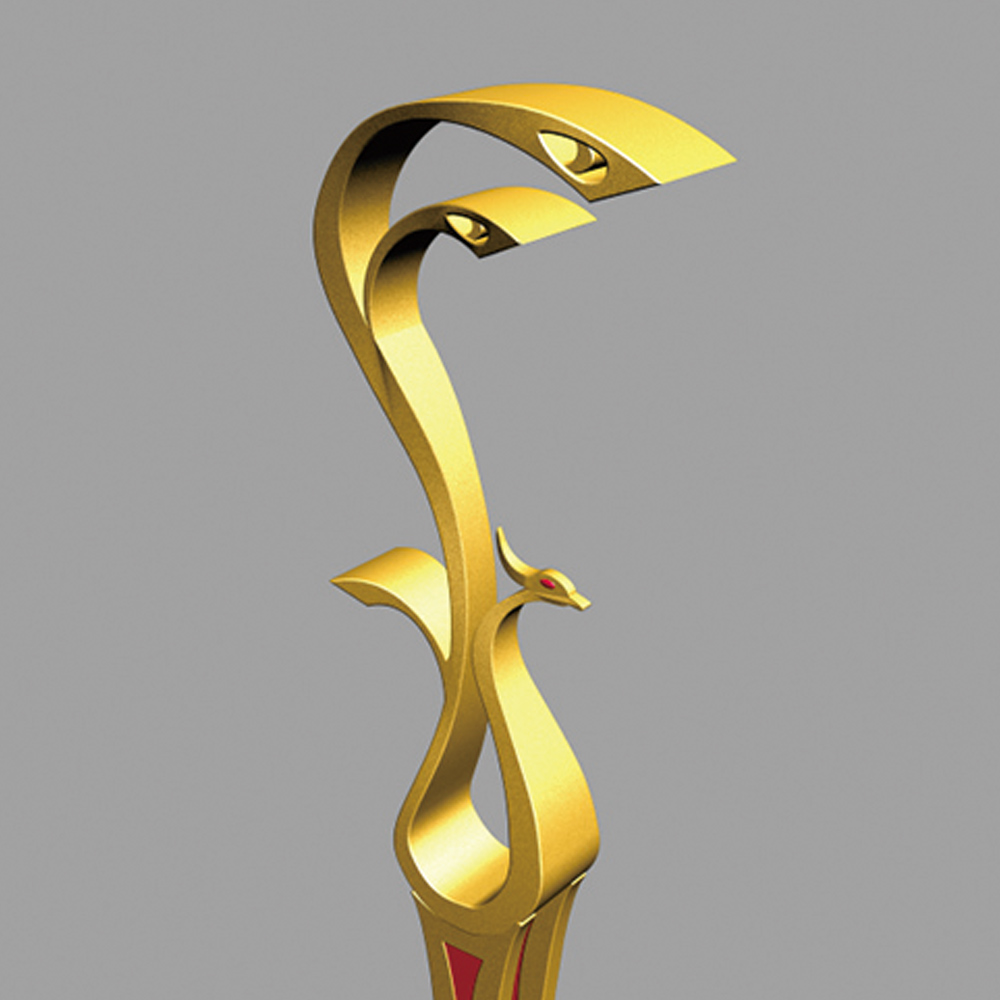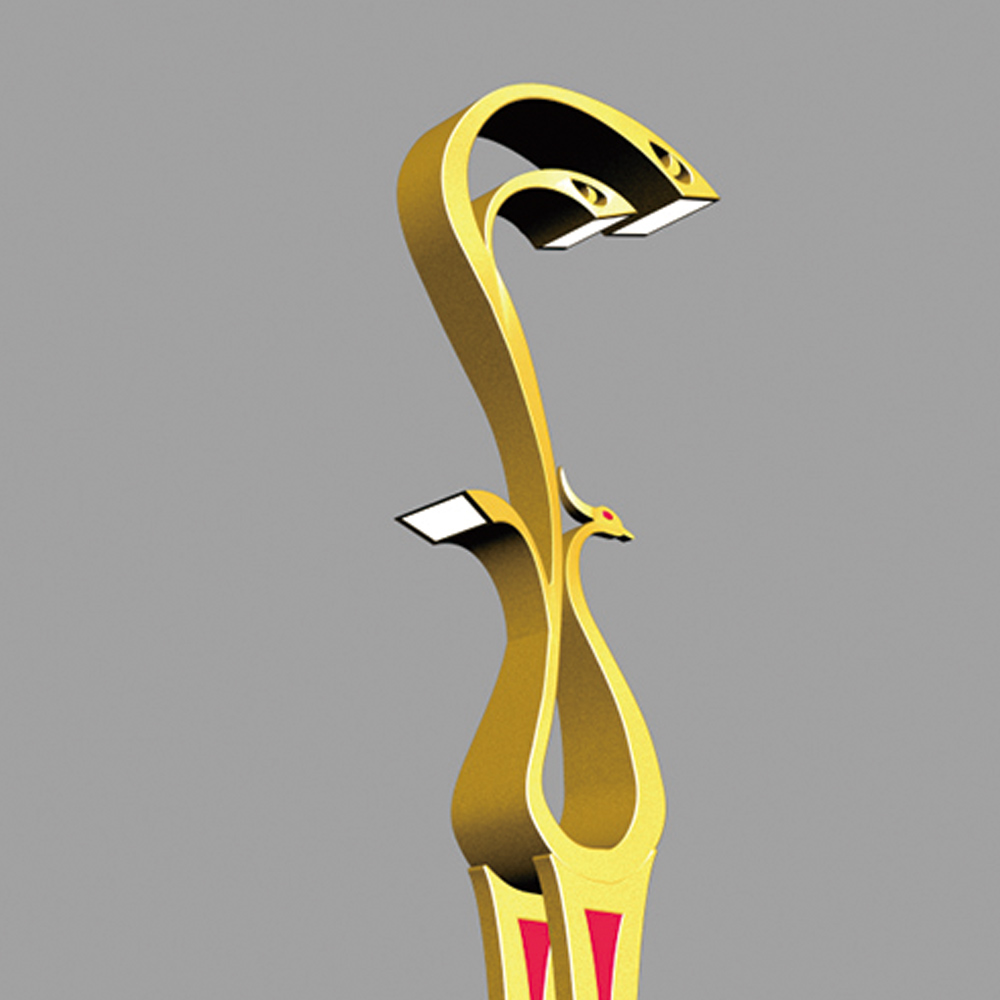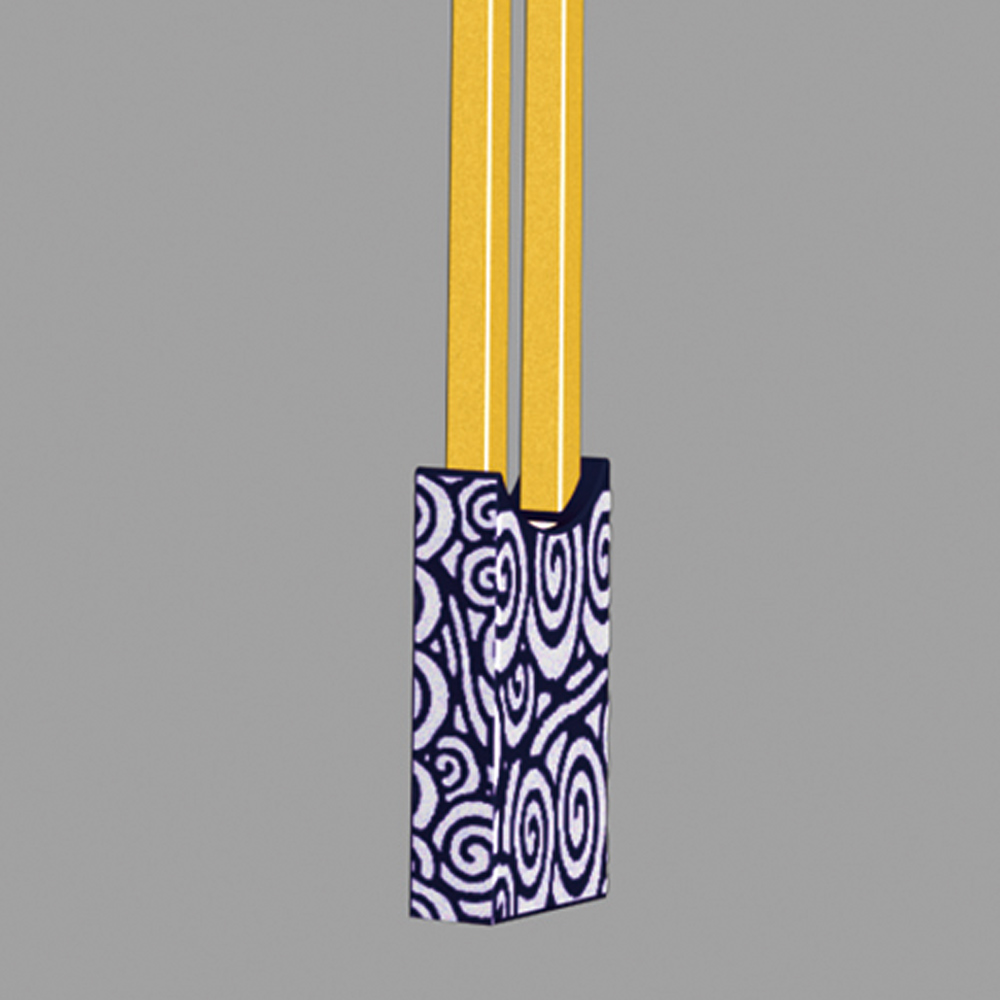 燈型上部為鳳凰的流線簡(jiǎn)化樣式,桿體采用夸張的手法表現(xiàn)鳳凰的腳腿,底座用強(qiáng)烈的對(duì)比方式,以藍(lán)、白相間的“祥云”紋飾來(lái)表現(xiàn)鳳舞九天的藝術(shù)效果;