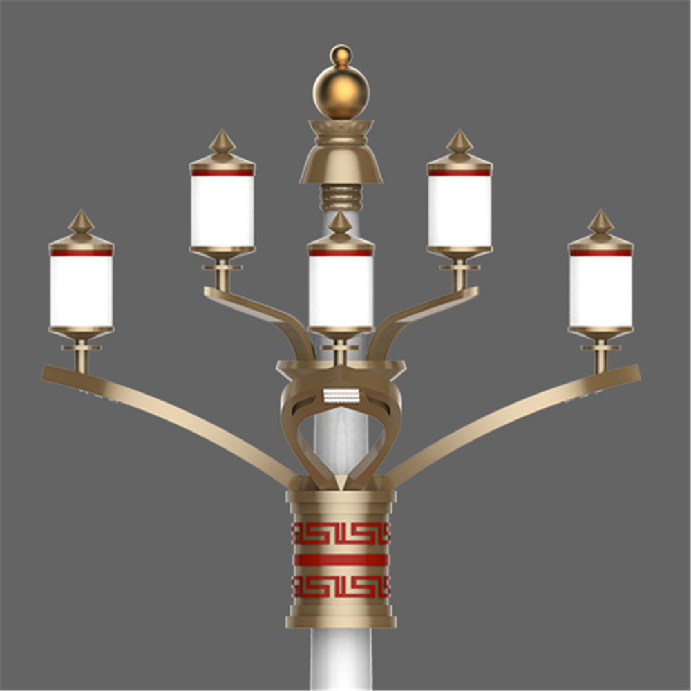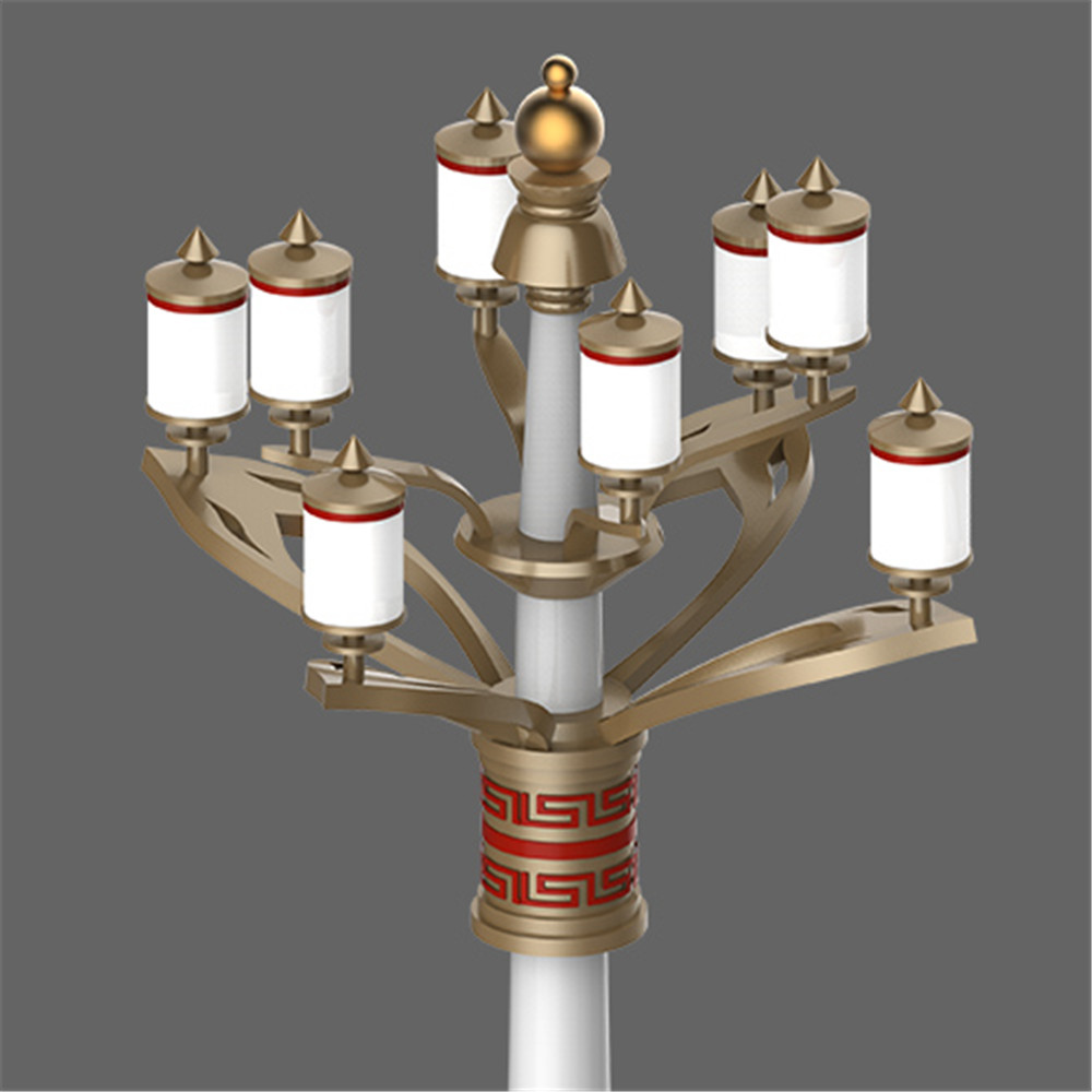 設(shè)計(jì)以蓮花為元素構(gòu)成燈臂,裝飾光源為藏傳佛教轉(zhuǎn)經(jīng)筒演化而來,蘊(yùn)含佛法光芒四射之意。白塔形式的底座表現(xiàn)濃厚的藏地色彩。